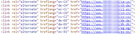 Anschließend müssen wir festlegen, wie die hreflang-Tags am besten eingebunden werden. Hierfür gibt es drei Möglichkeiten: Im <head> Bereich der Webseite, in der HTTP-Kopfzeile oder in einer Sitemap. Wir entscheiden uns für den <head> Bereich der Webseite. Wir bauen die Tags nicht selber ein, sondern ertsellen Vorgaben, auf deren Grundlage der Kunde sie selbst einbauen kann. Durch die Einbindung im <head> Bereich können wir direkt im Quellcode den Gesamtblock aller Tags überprüfen und feststellen, ob die Vorgaben richtig umgesetzt sind oder sich auf Grund der großen Menge an URLs Fehler eingeschlichen haben:
