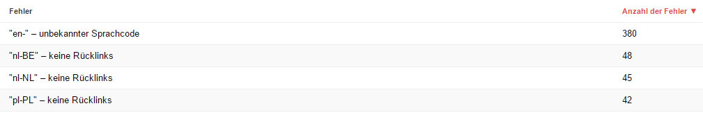 - „Keine Rücklinks“ sind ein Hinweis darauf, dass der Link im betroffenen hreflang-Tag selbst entweder keine oder fehlerhafte rückverlinkende hreflang-Tags aufweist. Hier muss sichergestellt sein, dass jede Seite, auf die per hreflang-Tag verwiesen wird, ebenfalls per hreflang-Tag auf die entsprechende Seite zurück verweist.