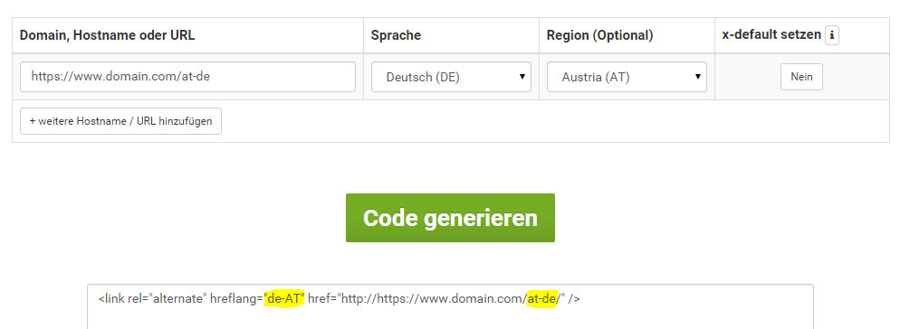 Eine gute Hilfestellung für solche Fälle bietet der hreflang Link-Attribut Markup-Generator von SISTRIX, mit dessen Hilfe der Code automatisch generiert werden kann.