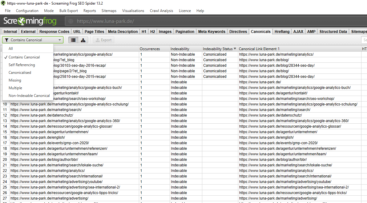 Nachdem die Seite gecrawlt wurde, könnt ihr über den Tap „Canonicals“ alle URLs abrufen, die einen Canonical-Tag haben.
