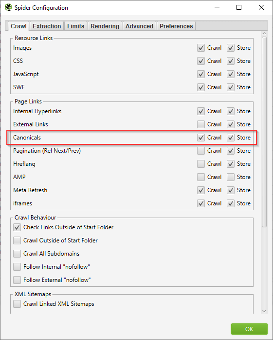 Bei der Verwendung des Screaming Frogs müsst ihr darauf achten, dass „Store“ und „Crawl“ für Canonicals in der Konfiguration aktiviert sind. In der Regel ist diese Einstellung standardmäßig aktiv. Zu der Konfiguration gelangt man über die Menü-Punkte „Configuration > Spider“.