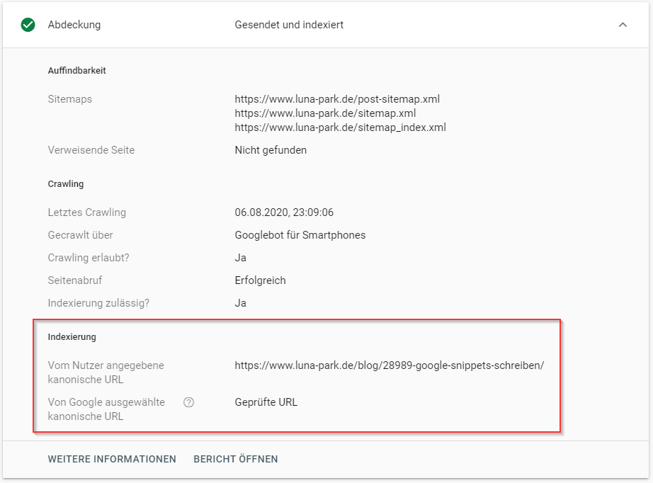 Da Google das Canonical-Tag eher als Empfehlung einstuft, kann es vorkommen, dass dieser Empfehlung nicht gefolgt wird. Mit Hilfe der Search Console könnt ihr einsehen, welche URL von Google als kanonische URL angesehen wird. Verwendet dazu die URL-Prüfung und gebt die entsprechende URL ein. Unter „Indexierung“ zeigt euch das Tool an, ob eure als kanonisch angegebene URL mit der von Google ausgewählten URL übereinstimmt.