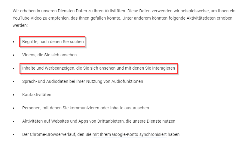 In der Datenschutzerklärung weist Google darauf hin, welche Daten gesammelt werden und für welche Zwecke sie verwendet werden.