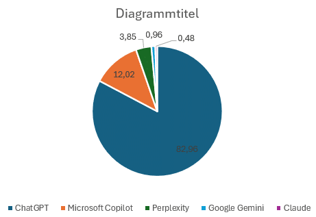 Die folgende Grafik zeigt die Suchmaschinenmarktanteile verschiedener KI-Tools im Oktober 2025. ChatGPT dominiert mit 82,96 % deutlich den Markt, gefolgt von Microsoft Copilot mit 12,02 %. Perplexity hält mit 3,85 % einen kleineren, aber wachsenden Anteil, während Google Gemini (0,96 %) und Claude (0,48 %) nur eine geringe Rolle spielen.